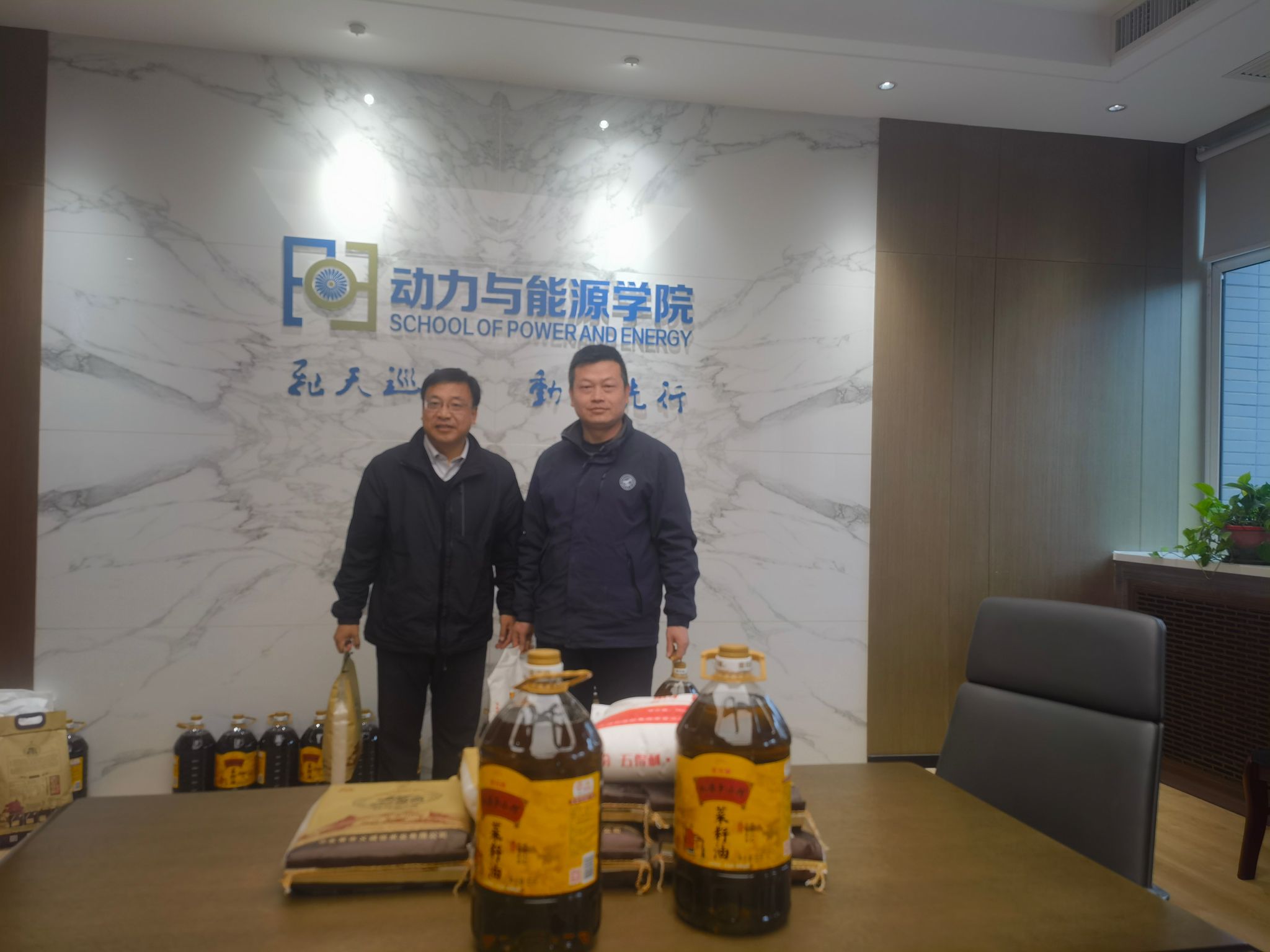 王占学代表公司感谢物业工作人员履职尽责,落实物业管理工作,不怕苦不怕累,出色地完成楼宇保障任务,为公司师生提供了一流的服务,让师生在安全、温馨的环境中开展教学科研工作。并向他们赠送了米、油等慰问品。