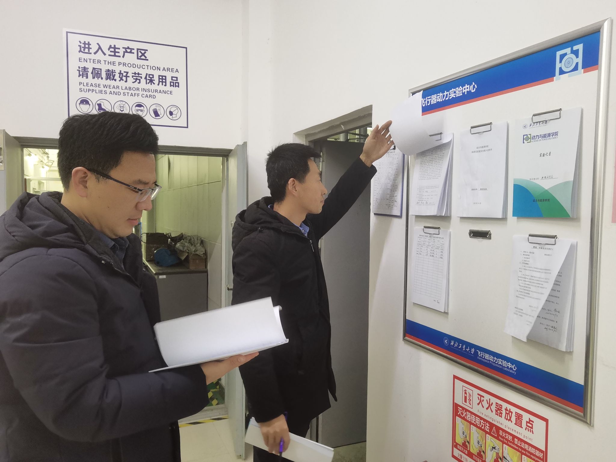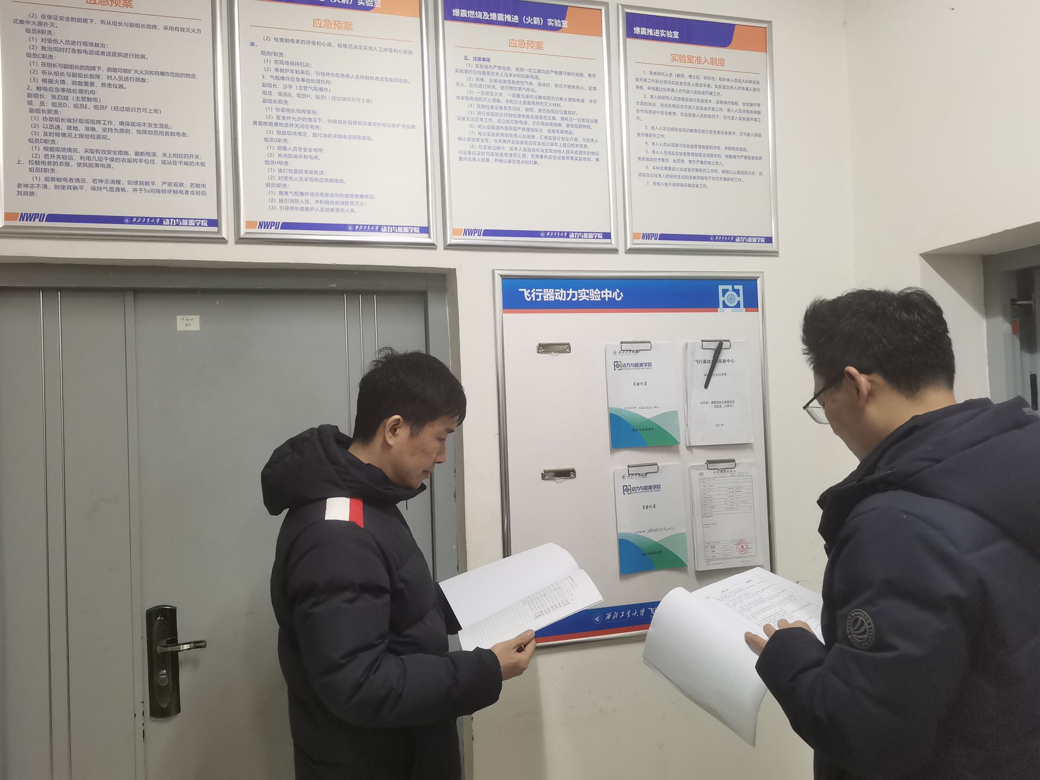 首先,安全检查小组到爆震推进实验室、燃烧实验室、叶栅实验室、先进航空动力润滑与空气系统实验室、动力机械寿命及可靠性实验室、传热及冷却实验室、吸气时高超声速推进系统实验室和通航/无人系统动力工程中心进行了检查,重点围绕实验室的危险源进行了安全检查。检查了实验项目风险评估报告、实验记录登记、危化品使用台账、特种设备管理、以及实验室的日常管理情况。检查中高文君对员工强调,要从思想上提高安全意识,开展实验前一定要考虑到实验中潜在的安全风险,熟悉应急预案,不清楚的多向老师请教,实验过程中一定要做好相关区域内的警戒,确保人员安全和设备安全。