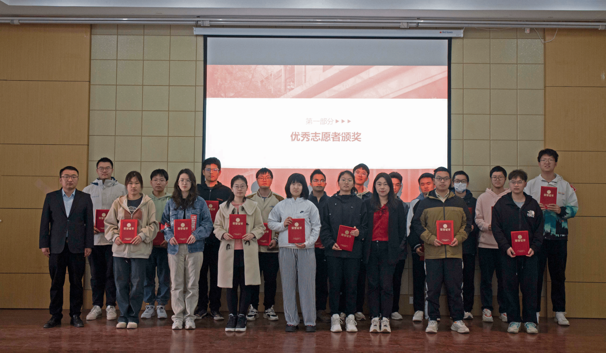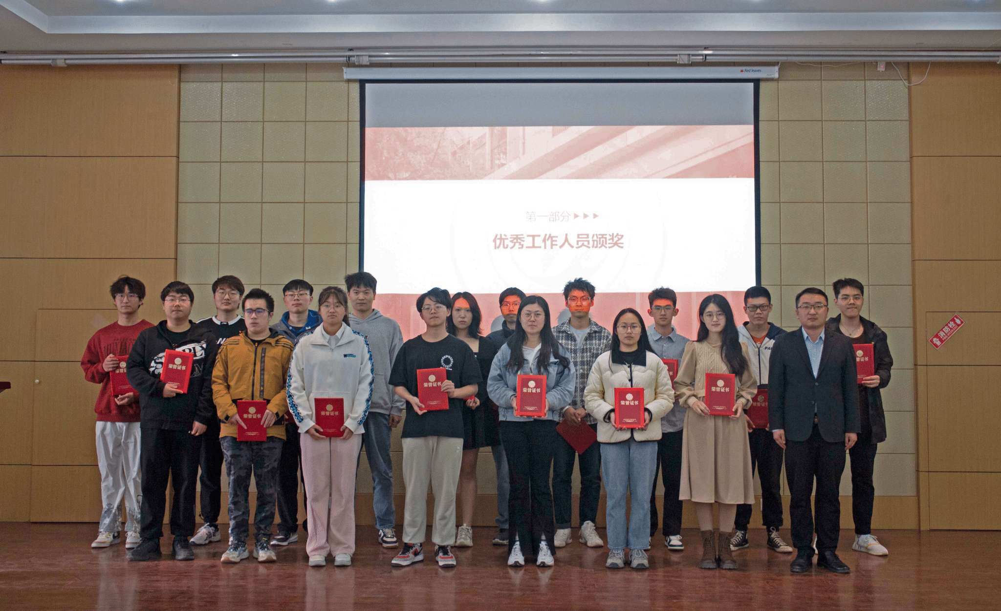 大会第一项,由徐永超老师与姜倩老师为公司团委、员工会、研究生会优秀工作人员及志愿者颁发证书并合影留念。