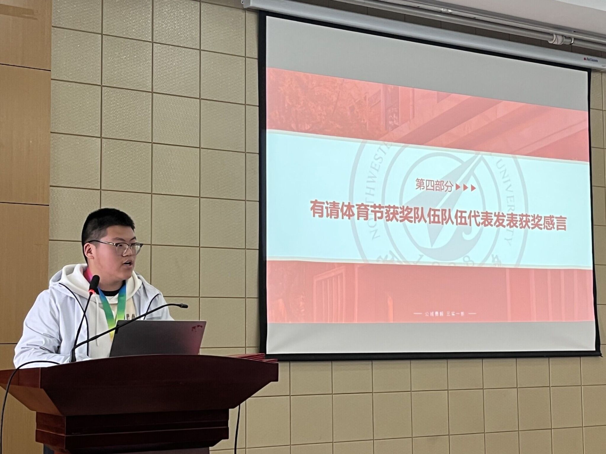 大会第四项,动能体育节获奖队伍代表徐帆帆同学登台发表获奖感言。徐帆帆同学感谢公司的支持和员工会同学们的付出,为热爱体育的同学们搭建了动能体育节这一良好的交流平台。他提到,在准备及参赛的过程中,同学们在团队协作中逐渐培养默契,更深刻体会到团结的重要性。最后,徐帆帆也鼓励大家积极参与体育活动,强健个人体魄,充实课余生活。