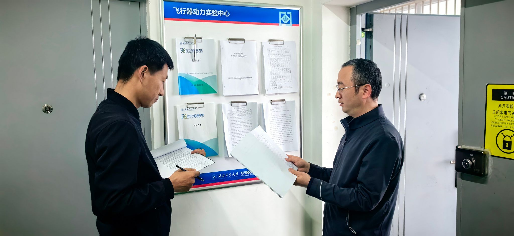 4月28日,安全检查小组到飞行器动力实验中心首先检查了楼内公共区域的安全疏散通道、应急通道、应急灯、消防器材、应急物资柜、地下燃油罐、公共气源储气罐等设施情况。随后深入到通航/无人系统动力工程中心、吸气式高超声速推进系统实验室、燃烧实验室、叶栅实验室、先进航空动力润滑与空气系统实验室、传热及冷却实验室、爆震推进等实验室进行了安全检查。对各实验室不同的危险源进行有针对性的检查,从实验项目风险评估报告、实验室准入制度、实验室安全培训、设备操作使用流程、实验记录、危化品使用台账、特种设备管理等方面进行了检查。检查中发现的问题能现场整改的要求实验室人员立即落实整改,现场整改不了的安全隐患第一时间下发整改通知单到实验室安全员并要求在规定时限内完成整改。