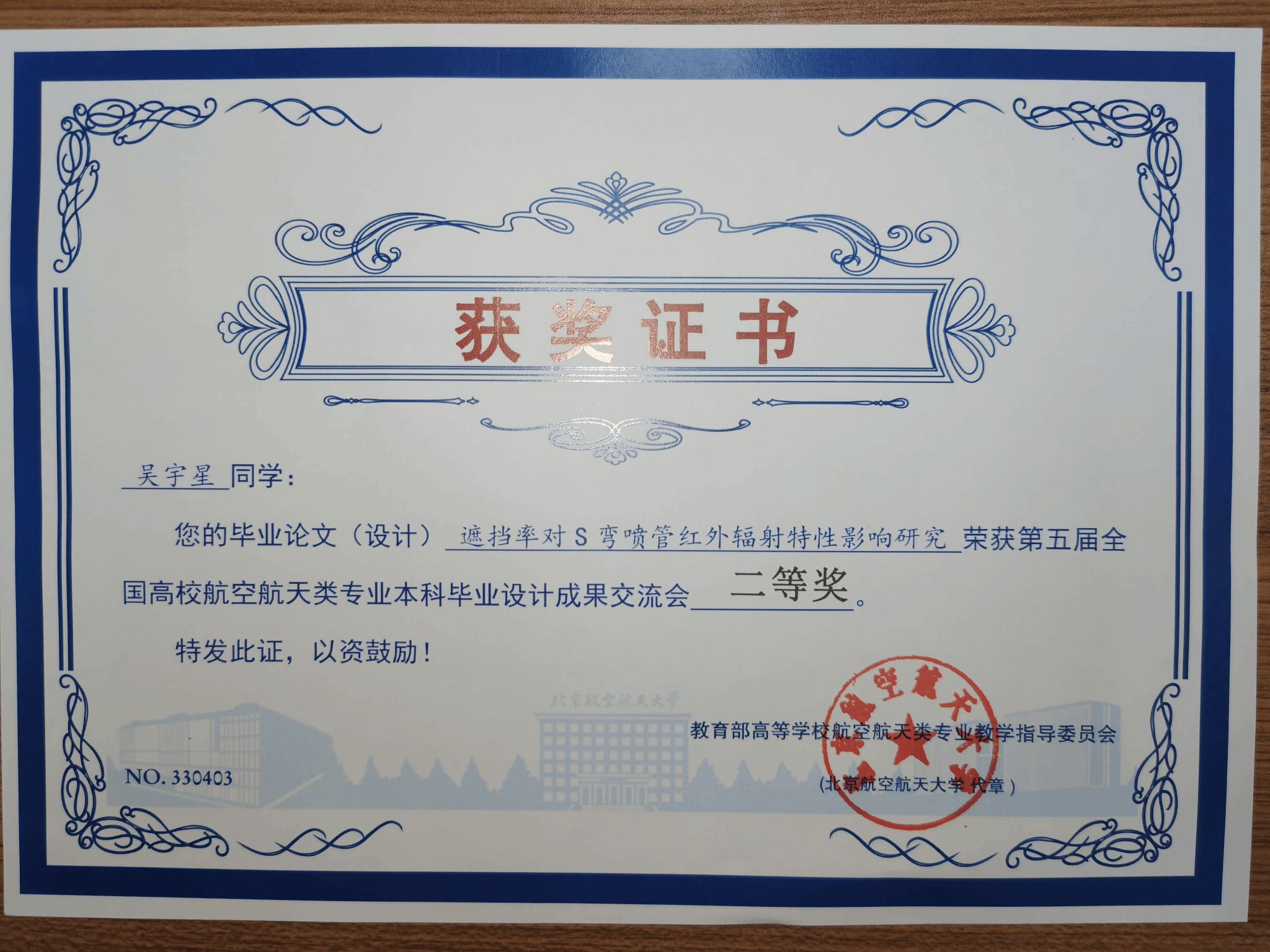 本届本科毕业设计成果交流会秉持“强化基础,突出实践,科教融通,勇于创新”的宗旨,以本科毕业设计论文为载体,通过校际交流,全面展示各高校航空航天类专业的人才培养特色及质量。交流会共有来自全国44所高等院校共309项毕业设计论文(成果)参加交流。经过一天的分组答辩、专家点评打分,最后经过评审委员会专家的综合评议,公司杨曦同学荣获一等奖,吴宇星同学荣获二等奖、陈飞同学荣获优秀奖。