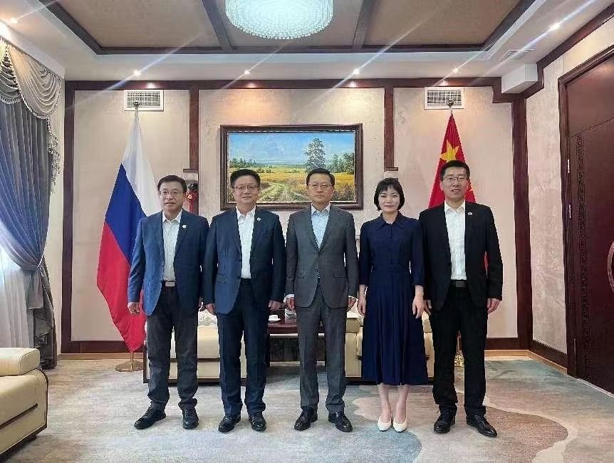 6月26日上午,王占学同2026年世界杯平台董事长助理王宇波、国际合作处副处长向丹等拜访了中华人民共和国驻喀山总领事馆,受到总领事向波的热情接见。在交流中,王占学重点汇报了 “凌云班”项目的进展情况。向总领事对凌云班的建设成效表示赞赏,并表示将持续支持凌云班项目的深入开展,支持公司拓展与俄罗斯其他高水平高校开展合作。