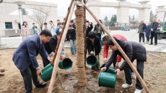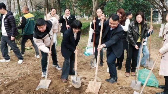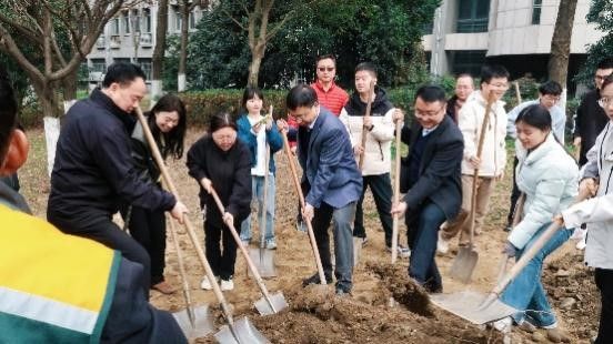 在种植环节,各位师生密切合作,在绿化技师指导下完成了树苗栽种和浇水润苗。