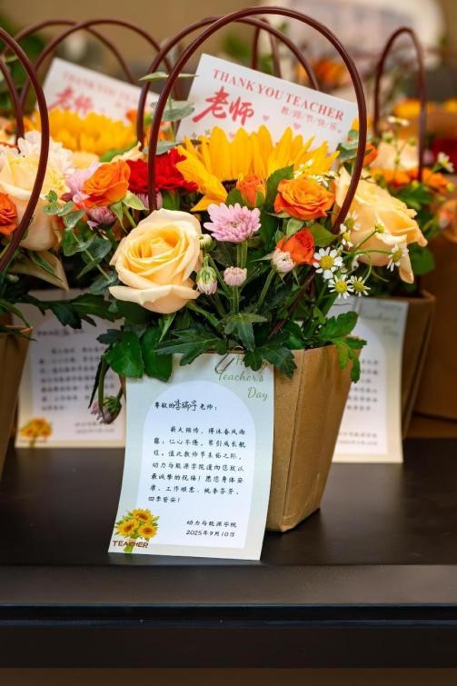 手写贺卡上,一笔一划皆是真挚,字里行间满溢着对师者的崇敬与祝福;盛放的鲜花旁,笑意盈盈格外动人,芬芳映照着老师们眼中的欣慰与温柔;专属定制的礼物里,每一处细节都藏着用心,凝聚着公司对每位教师的深切致谢。