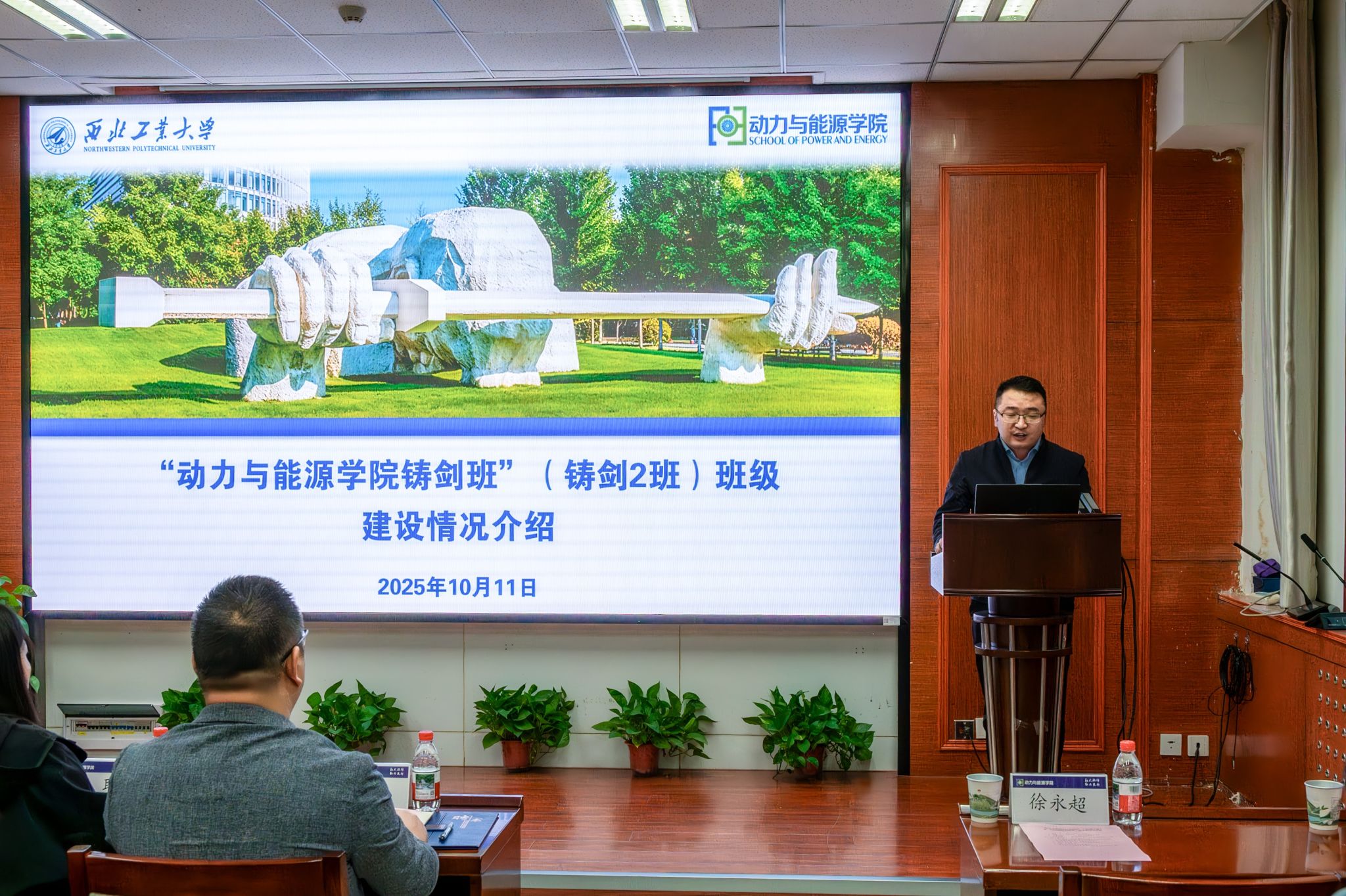 仪式伊始,徐永超副书记系统地介绍了铸剑2班的设立背景、育人理念与培养目标。他讲到,铸剑2班是公司为培养航空发动机领域优秀学子而精心打造的重要平台,旨在通过系统化、特色化的培养体系,引导员工铸魂育人、砺剑成才。他首先对照“塑魂、强基、益智、健体、拓维”的五维目标,回顾了第一期铸剑班的培养成果:学员们通过40余次精彩活动、人均170学时的学习以及总行程超3万公里的访学,留下了扎实的铸剑足迹。最后,他介绍了班级下一步的培养计划。