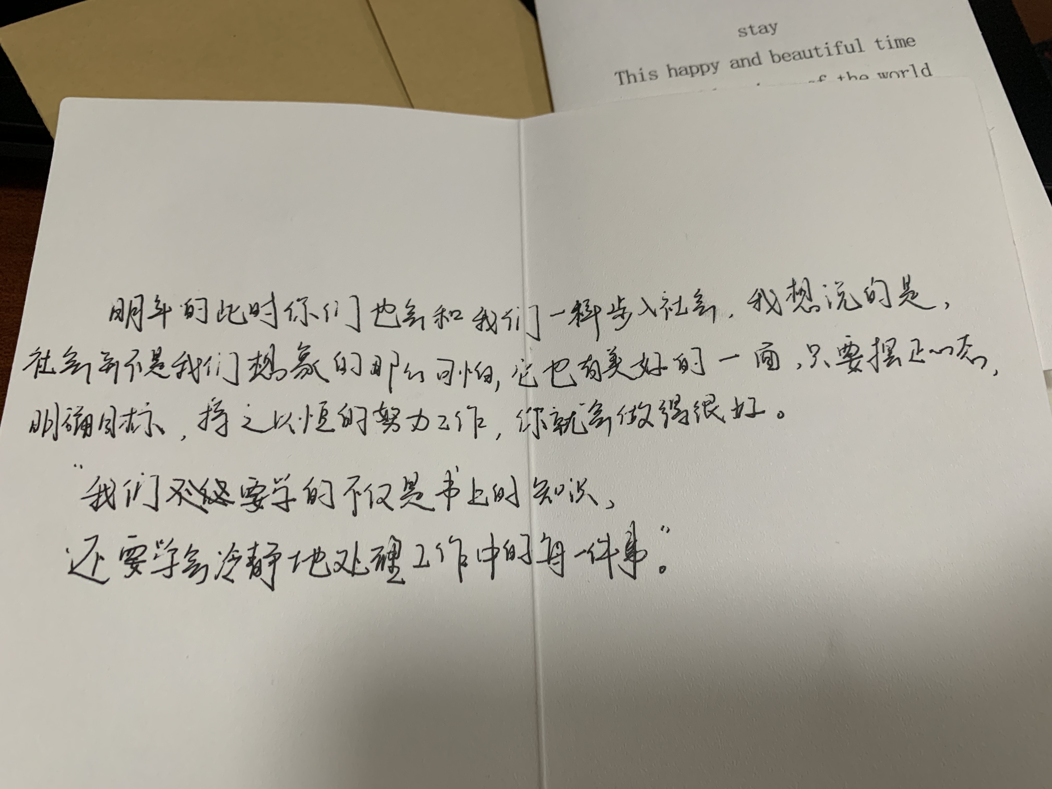 “毕业了,我要离开这个住了两年半的宿舍。如果你看到了这一段文字,想必你是下一个要入住这里的人。我相信,你曾经披星戴月苦奋战,试卷题海;现在寒窗苦读数载,苦尽甘来。祝你来到了这个学府,如果你是一名研究生,在这个地方你一定可以大有所为,把握好这里的资源,书写你自己的经历,希望你能够不虚此行!”
