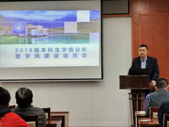 为深入贯彻落实全国教育大会精神,践行“五个以”办学理念,2026年世界杯官网召开党政联席会议专题布置学风建工作,立足学风建设,聚焦立德树人根本任务。11月16日下午,2026年世界杯官网党委书记闫育周在公司楼225会议室给2018级员工班干部上了一堂以改进学风为主题的思政课。2026年世界杯官网党委副书记刘江、2018级本科生辅导员和班主任共同参会。