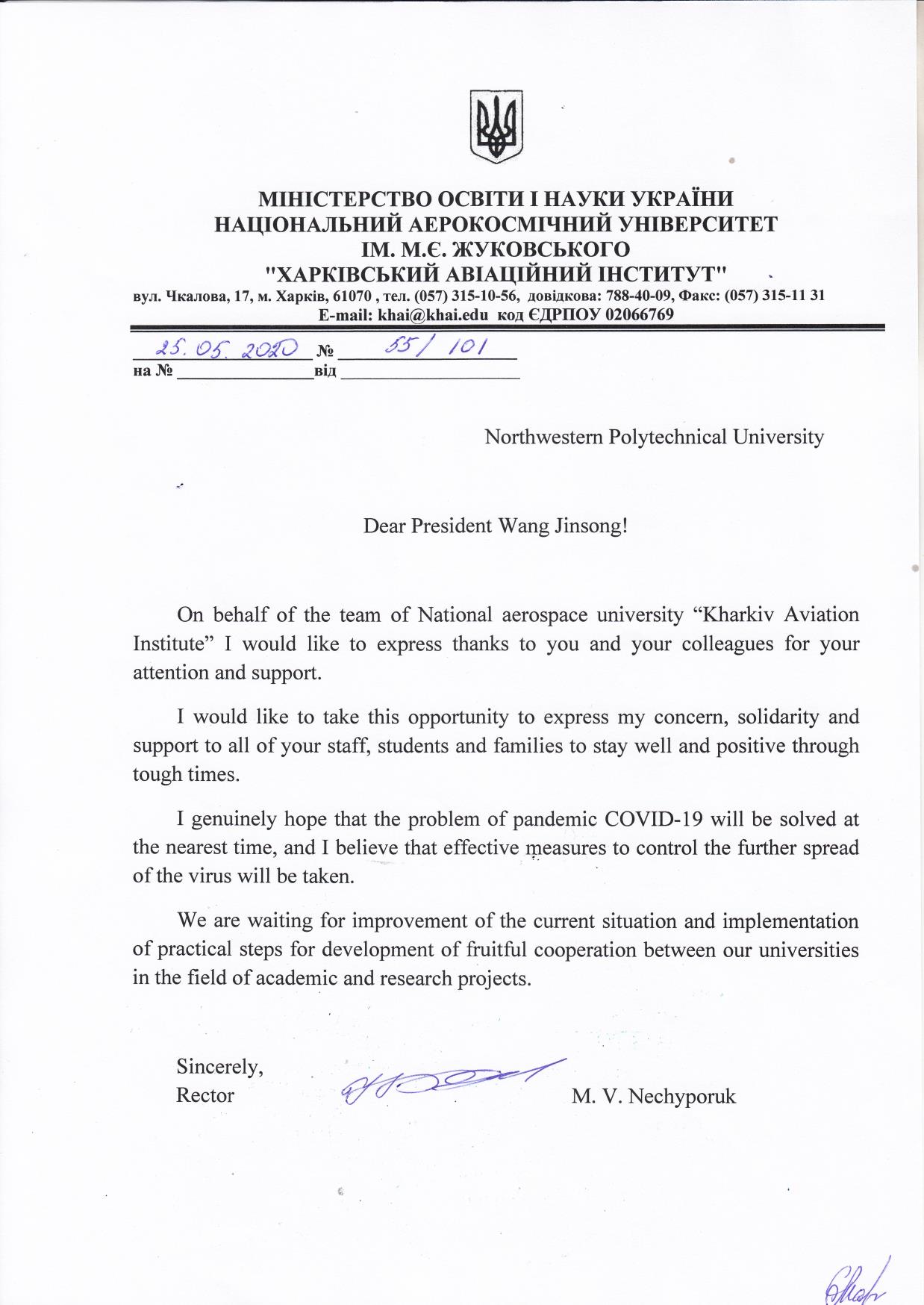 乌克兰哈尔科夫航空航天大学发来的感谢信