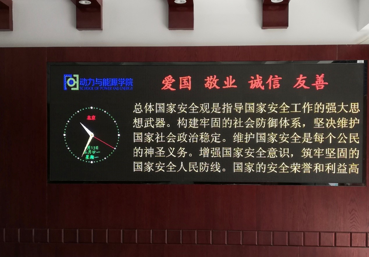 3、 公司LED显示屏宣传全民安全口号。告诉人民国家安全的根基在人民、力量在人民、血脉在人民,国家的安全荣誉和利益高于一切,维护国家安全是每个公民的神圣义务,他将有力的提高师生国家安全意识。