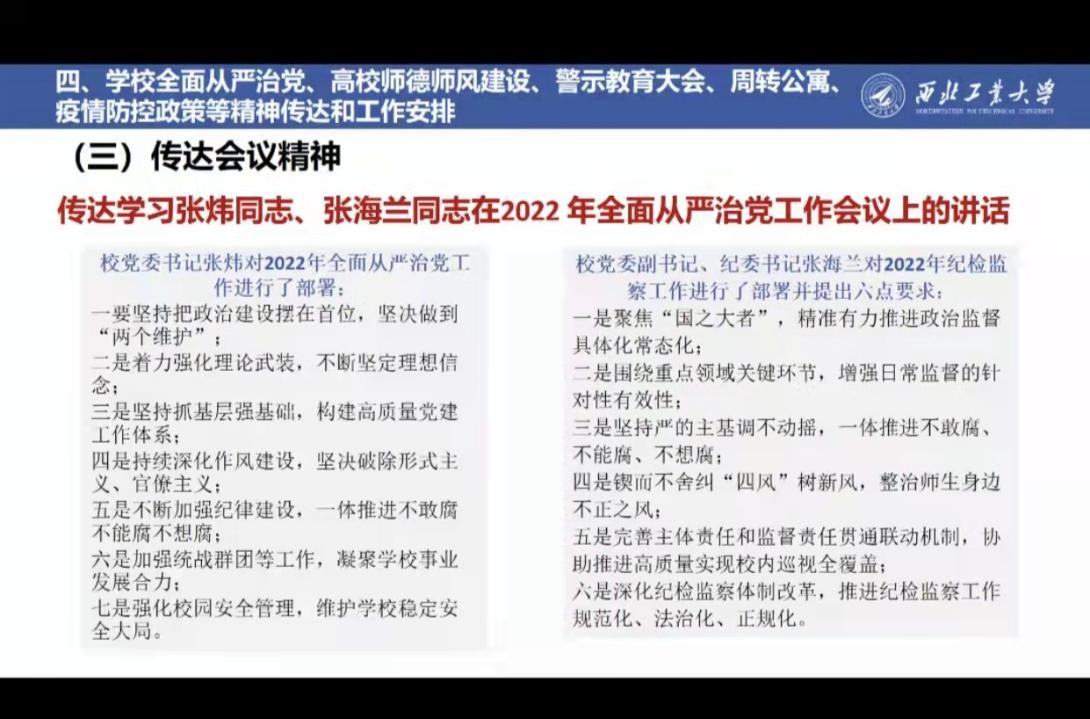 最后,闫育周书记传达了党群工作例会的相关要求,包括教职工周转公寓工作以及疫情防控工作。对教职工周转公寓工作的主要环节进行通报,对申请流程进行详细全面讲解。闫书记再一次强调了疫情防控的重要性和迫切性,要求各位老师严格按要求执行,齐心协力筑牢疫情防控防线。