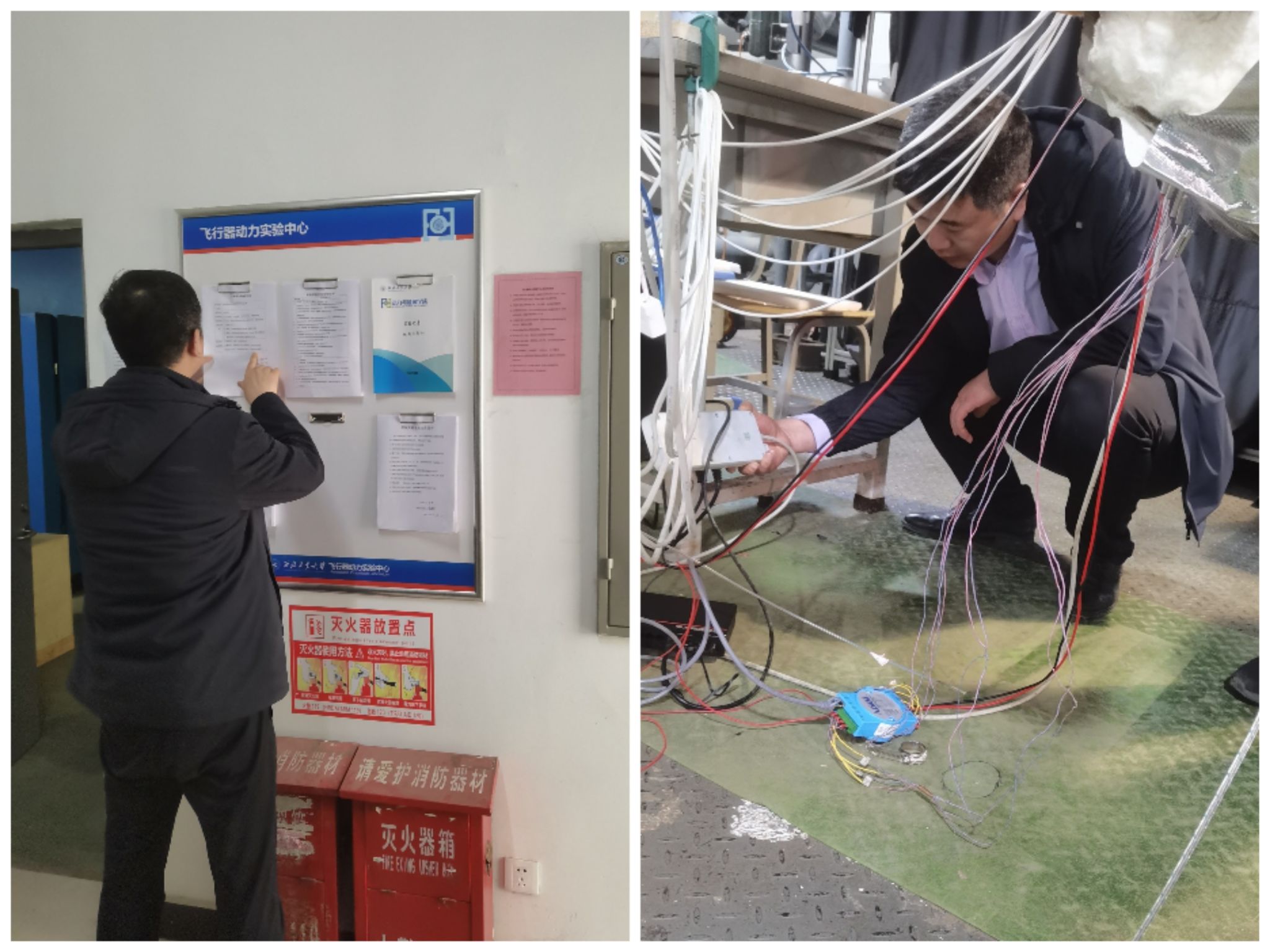 下午,刘涛讲师、公司董明涛老师等到飞行器动力实验中心开展安全隐患排查。在实验室现场查看了安全管理制度、工作环境、防护用品、消防器材、应急逃生通道、特种设备、危化品管理、用电安全等,在排查过程中刘涛老师积极和实验室老师探讨实验室安全隐患排查和实验室管理等问题。