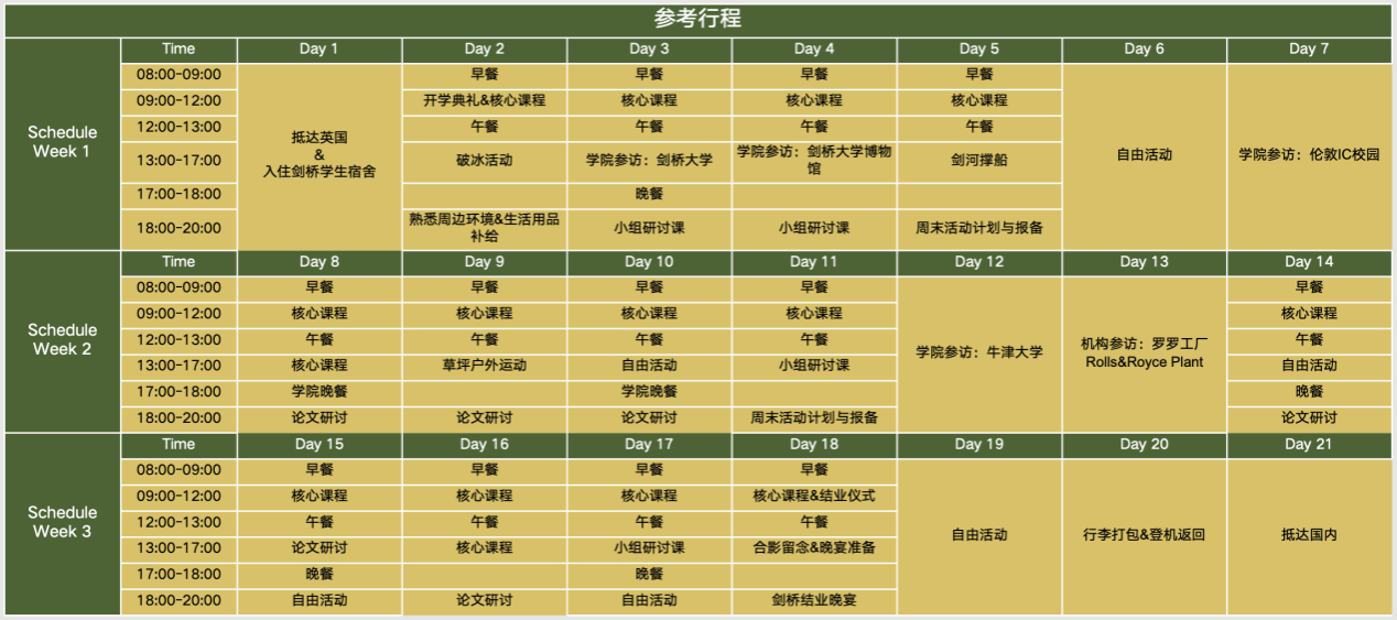项目为期3周,线下课程共计60课时,员工将注册成为剑桥大学暑期员工,入住300年历史的公司。在课程之外,员工还将探访Rolls & Royce航空发动机研发中心、帝国理工大学、牛津大学等世界顶尖名校。员工在完成项目后,将获得由剑桥大学官方颁发的项目证书和成绩报告,优秀员工还将获得授课教授的推荐信。