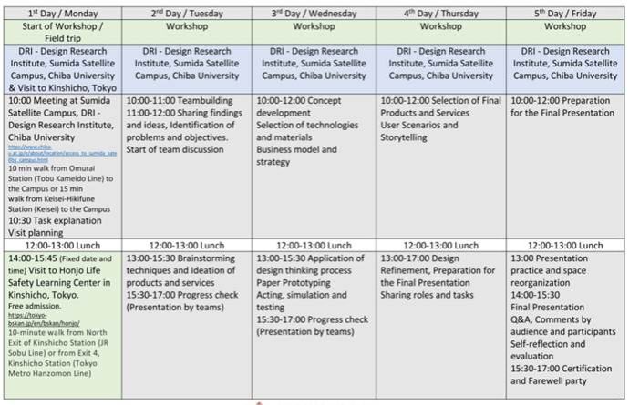 本次项目立足于“灾难防治管理设计”(Design for Disaster Preparedness) 的主题,将使用以下四种方法来提出具体的设计建议:如何创建用户场景(User scenarios)、如何为灾害管理创造产品或服务的概念(created concepts of products or/and services for disaster preparedness)、可视化业务画布构建(Visual business canvas construction)、纸上原型方法(Paper prototyping method)。千叶大学将以上四种方法牢牢结合实际,同时让同学们有机会参与设计讨论和展示,旨在培养能够灵活顺应时代的需求,引领设计先驱的国际化人才。
