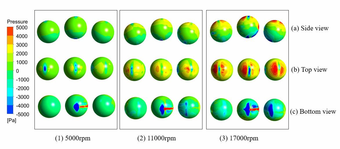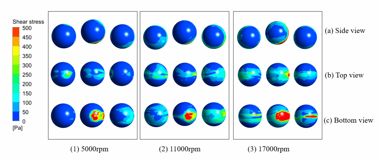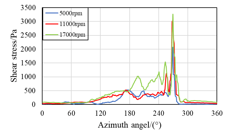 数值计算结果表明当滑油通过供油孔进入轴承时,它在球体的底部产生旋涡,然后沿着球体与保持架之间的间隙流向外环。随着轴承转速增加,轴承内流体速度也在增加,如图2所示。图3为不同轴承转速下球体表面的压力分布,轴承旋转引起的离心力导致滑油在外环附近聚集。由于球体与外环之间的间隙较小,流体速度增大,导致球体上方出现低压区。此外,内环的旋转速度大于球体公转的转速,当供油孔面向球体的底部时,滑油直接喷射到球体的表面,产生压力差,这就导致了供油孔前的低压区和供油孔后的高压区。随着轴承转速的增加,球体表面压力也在增加。从图4(a)和图4(b)中可以明显看出这一点,图4(a)为上半球的压力,图4(b)为下半球的。下半球的压差明显大于上半球的压差,当轴承转速从5000rpm增加到17000转rpm时,压差增大1.85倍。图5为不同轴承转速下球体表面的剪切应力分布,剪切应力主要集中在球体与其他部件(如内环、外环和保持架)的接触区域。环下供油孔会显著影响球体表面的剪切应力分布,从而产生更大的剪切应力。随着轴承转速增加,球体表面的剪切应力范围扩大。图6为环下供油孔面向球体底部时,由上半球到下半球360°的剪切应力。随着轴承转速增加,轴承部件的相对速度增加,导致球体表面的剪切应力增加。球体表面的压差和剪切应力形成了拖曳力,图7为不同轴承转速下单个球体旋转一周的平均拖曳力。由于滑油从环下供油孔进入轴承与内环一起旋转,因此滑油在轴承内的周向运动速度比球体公转快,导致后半球的压力比前半球大。通过分析发现拖曳力方向与球体的公转方向一致,即拖曳力是环下润滑球轴承中球体公转的驱动力,这与喷射润滑不同。当轴承转速为5000rpm时,拖曳力为0.36 N;当轴承转速为17000rpm时,拖曳力为1.47 N,增大4.08倍。