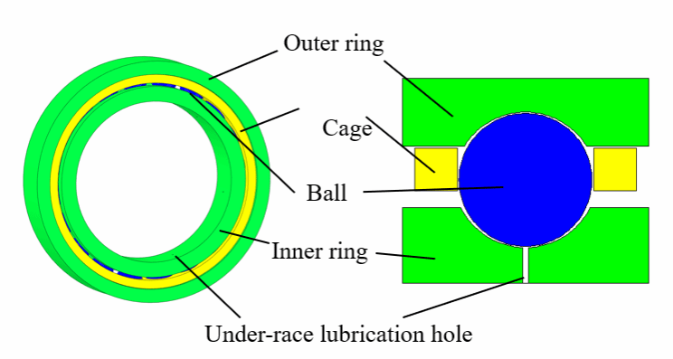 随着航空发动机推重比和经济性不断提高,其主轴转速也越来越高,在高DN(转速(r/min)×内径(mm))值情况下轴承会产生大量的热,为确保轴承在适当的温度范围内运行,滑油对于轴承的润滑和冷却至关重要。环下润滑通过内环上的供油孔依靠高速旋转离心力的作用甩入轴承,实现轴承内的有效润滑和冷却。与喷射润滑相比,环下润滑在高速条件下具有优异的润滑和冷却效果,已被广泛应用于现代航空发动机。当球体在这种流体环境中旋转时,它会受到流体剪切应力和压差,称为拖曳力。在高速情况下,由拖曳力引起的流体粘性摩擦(也称搅油损失)可能占轴承总功率损失的50%。环下润滑显著改变了轴承内的油气两相流,并影响流体所产生的粘性摩擦。目前针对润滑流体环境球轴承中球体拖曳力的研究主要依赖于等效单相流体环境中的简化模型,没有考虑内环和外环的影响。轴承中球体与滑油之间的相互作用是经验性的,不确定的。由于轴承的摩擦学、动态性能和换热特性取决于作用在球上的拖曳力,因此全面分析环下润滑对轴承球体拖曳力的影响具有重要意义。为此,本文建立了一个基于航空发动机应用背景的环下润滑球轴承模型(如图1所示)。通过数值和实验研究,分析了内环和外环以及多个球体之间的相互作用对流动特性的影响,讨论了不同条件下球体的拖曳力,并建立了一种预测轴承中球体拖曳力的方法。