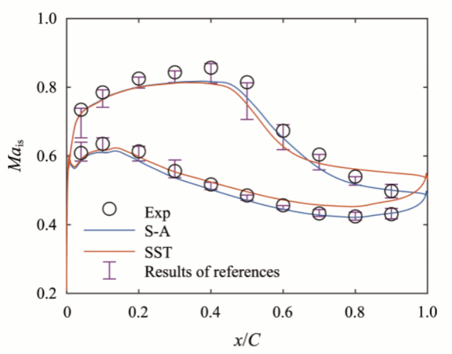 对航空发动机日益增长的更高性能、可靠性和经济性的需求推动了流场预测技术的进步。发动机中的压气机用于来流空气减速增压,对发动机的安全性、推力和油耗至关重要。压气机中存在流动分离和强逆压梯度。高负荷压气机中的流动更加复杂。压气机测试可以提供真实的运行数据,是评估压气机性能的金标准。测试测量数据来自真实的压缩机流场,因此与数值模拟数据相比,它是高保真数据。然而,安装在测试台上的传感器或探头的数量是有限的,在测试过程中只能测量几种物理量。相比之下,基于计算流体动力学(CFD)的流场数值模拟可以提供整个流场的所有物理量。然而,使用湍流模型的CFD结果往往与实验数据存在偏差,特别是对于复杂的流动,如压气机中的流动,如图1所示。在非设计工况下,偏差往往更为明显,不同的湍流模型获得的结果也有明显差别。有必要采取措施提高CFD预测精度。当前基于CFD的研究中,实验测量数据主要用于验证CFD计算结果的大致正确性,没有参与具体的预测过程,宝贵的实验测量数据被利用的并不充分。由此开展了实验数据驱动的压气机叶栅流场增强预测研究,以提高压气机叶栅流场的预测精度。