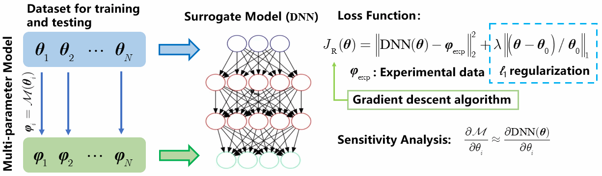 在损失函数中添加了ℓ1正则项,该项为参数相对修正量的ℓ1范数,作用为防止对参数的过度修正,ℓ1范数具有天然稀疏性,常在机器学习算法中用于防止过度拟合,在此用于防止过度校正。因为神经网络模型本身具有一定误差,实验测量结果也具有一定不确定度,若没有正则项约束,模型误差及测量噪声会严重影响校正过程,造成过度预测,类似于过拟合。