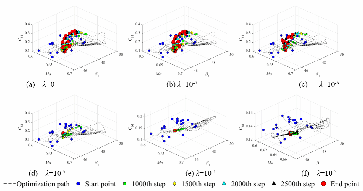 所提出的基于深度学习和ℓ1正则化的实验数据驱动流场预测方法可以为压气机叶栅流提供高保真的流场数据。ℓ1正则化有助于提高非线性损失函数的凸性,避免局部极值问题。入口边界条件和湍流模型参数的校准可以将预测误差降低近70%。边界条件校正减小了弦前半部分的预测误差。校准的湍流模型解决了尾缘附近吸力面上流动分离区的过高预测问题。两种湍流模型预测的流场几乎相同;即它们独立于特定的湍流模型。沿叶片表面等熵马赫数的敏感性分析表明,入口马赫数影响整个弦;然而,入射角主要影响前半弦。主要修改的湍流模式参数Cb1和a1主要影响弦的后半部分。