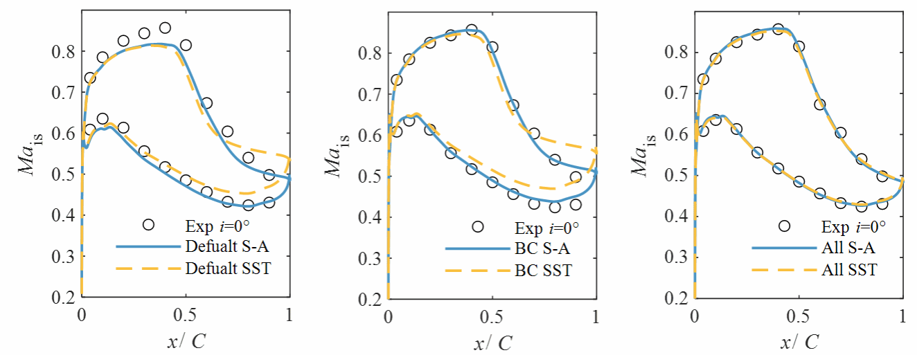 可以看出进口马赫数影响叶片表面全域,进气角主要影响前半弦长,而湍流模型系数主要影响后半弦长区域。