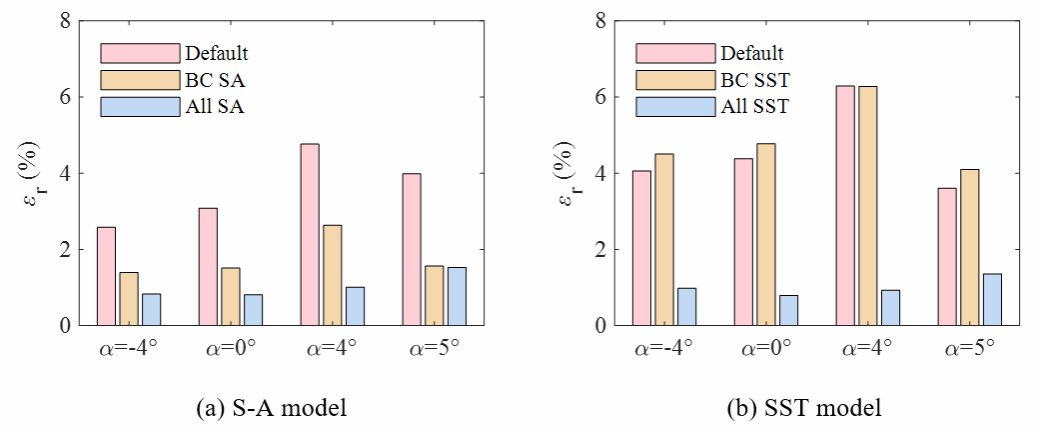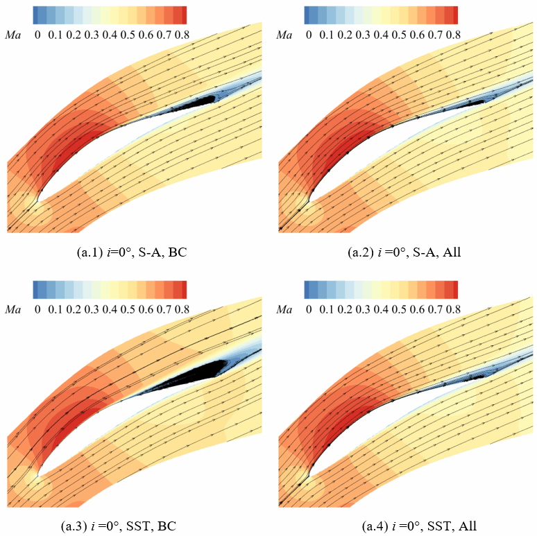 在获得损失函数的极小值后,利用最优参数重新进行流场数值计算,即可获得高保真且与湍流模型无关的增强预测流场。图4显示了设计工况时,使用原始参数(Default)、仅校正来流边界条件(BC)和校正了进口边界条件和湍流模型系数(All)的计算结果叶栅表面等熵马赫数分布。预测时使用了两种湍流模型,可以看出进行实验数据驱动预测后,两种湍流模型结果几乎完全一致,且与实验结果高度相符。图5进一步显示了四种工况参数校正前后预测相对偏差的分布情况,预测偏差总体减小了约70%。图6、图7、图8分别展示了湍流模型参数校正前后流场参数的分布情况,校正后的吸力面分离区减小,分离点后移。尽管使用了两种不同的湍流模型,在校正湍流模型后,两种模型的预测结果基本是一致的,由此验证增强预测流场基本实现了结果与湍流模型的选择无关。