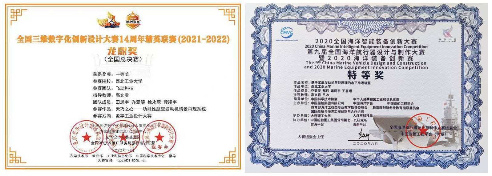 在关心员工课程学习之余,高老师还积极指导员工参加各类学科竞赛,组建并指导了包括“酷轮科技”和“飞动科技”为代表的多支优秀团队。其中,“酷轮科技”提出了一种“内外双流道高效螺旋桨”技术,员工在大一学年即荣获全国海洋航行器设计大赛特等奖和全国节能减排竞赛一等奖,团队被评为19-20学年“模范员工团队”,成员最后全部免试保送研究生;“飞动科技”专注于航空发动机创新技术开发,申请的5项发明专利仅一年即获授权,团队先后荣获全国三维数字化创新设计大赛一等奖、iCAN创新创业竞赛西北赛区一等奖等省级以上竞赛奖项6项,同样也获得了“模范员工团队”的称号,其中2人获得“航空强国中国心”教育基金创新奖,2/3成员免试保送研究生。此外,高老师还指导了国家级“大创”项目4项、省级“大创”项目3项,累计获得省级以上学科竞赛奖励和项目超过15项。