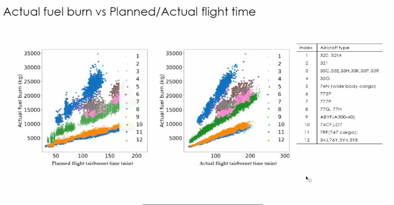 针对常规油耗预测模型与实际存在较大差别这一难题,李立帅副教授基于航空公司提供的飞行数据基于深度学习方法对进行数据挖掘分析,其研究发现造成飞行时间存在误差的原因主要是天气原因和空中交通拥堵,从而造成常规油耗预测模型与实际存在较大差异。通过不断优化深度学习模型可以改善油耗模型的预测精准度,降低航空公司运营成本。此外,基于深度学习方法对对多因素影响下的飞机加油量进行系统建模,可使加油量降低1%到12%,显著降低碳排放。