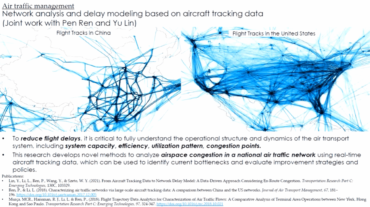 李立帅副教授针对航空公司飞机跟踪数据网络进行分析与时延建模。采用可视化的方法展现出中国和美国航班的航班数据,深入分析研究由于空中管制、天气及安全要求等因素引起的航班延误。