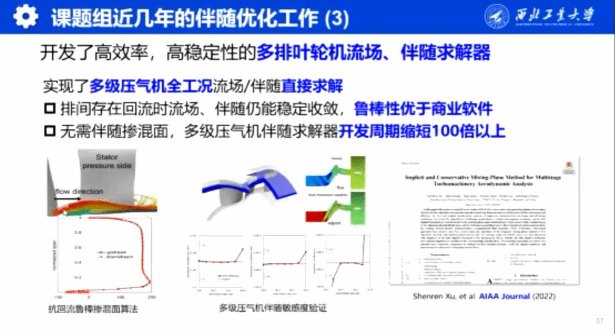 然后,徐慎忍副教授介绍其所在课题组近几年在伴随优化工作上的进展与成果,其团队开发的高效率、高稳定性伴随求解器不仅大大缩短了求解器的开发周期,而且鲁棒性优于商业软件。近期在实际工程项目中进行了应用并显著提高了优化设计效率。